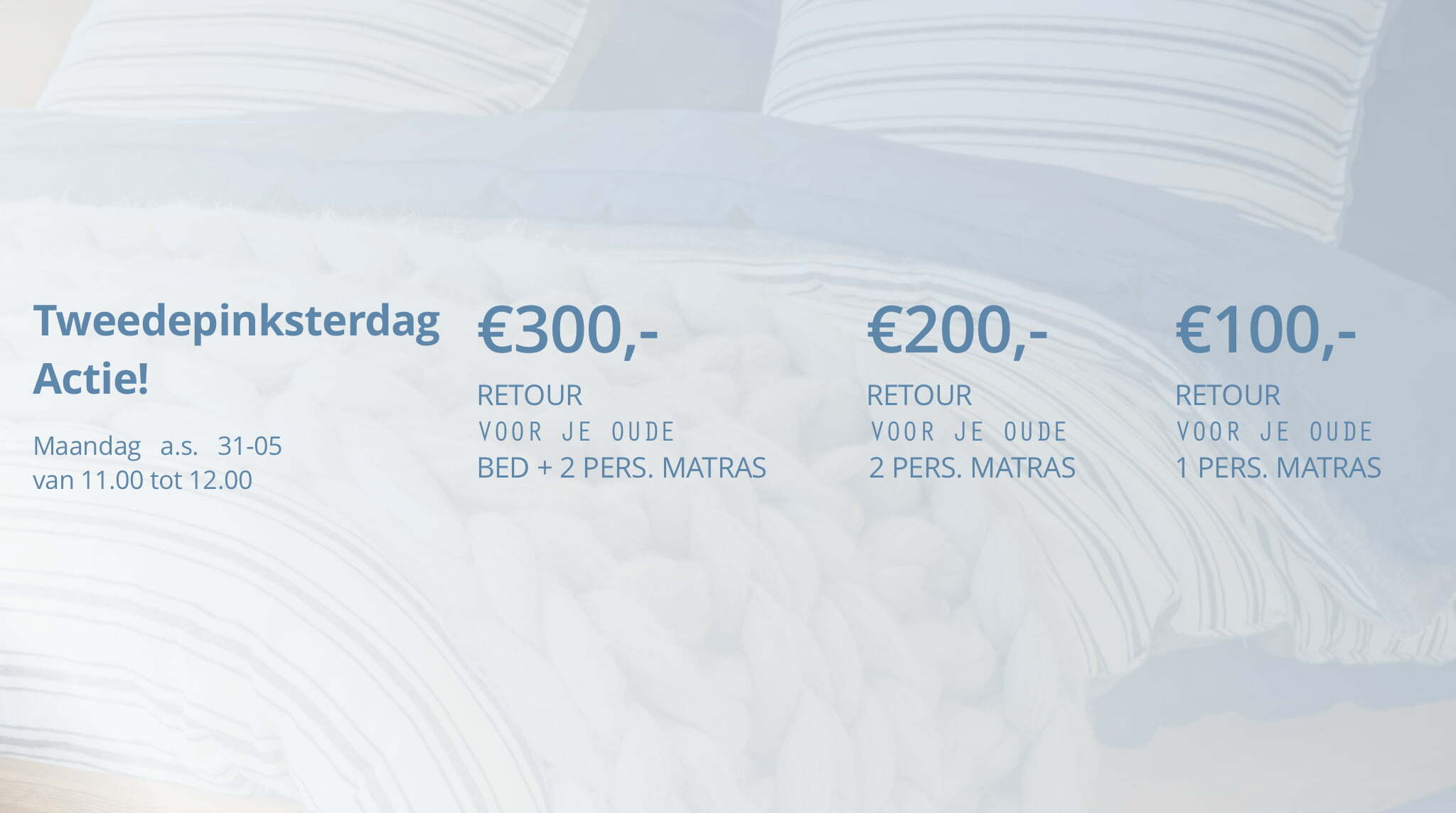 ✅ We gaan het gewoon doen, we geven €300,- retour voor je oude bed als je bij ons een nieuw bed of matras koopt op Tweede Pinksterdag tussen 11.00 en 17.00 uur.