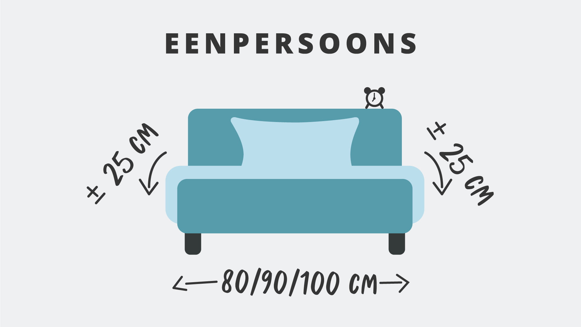 Bij een eenpersoons bed zijn er een aantal maten mogelijk, zo kun je kiezen tussen de breedtes 80, 90 of 100cm breed. Ook de lengte kan erg belangrijk zijn, zo zijn de lengtes 190, 200, 210 of zelfs 220 mogelijk. Onze slaapadviseurs helpen je graag bij het maken van een keuze voor de afmetingen, zij stemmen dit natuurlijk af op jouw wensen! Wil je samen met een adviseur jou ideale bed samen stellen? Klik dan hier.