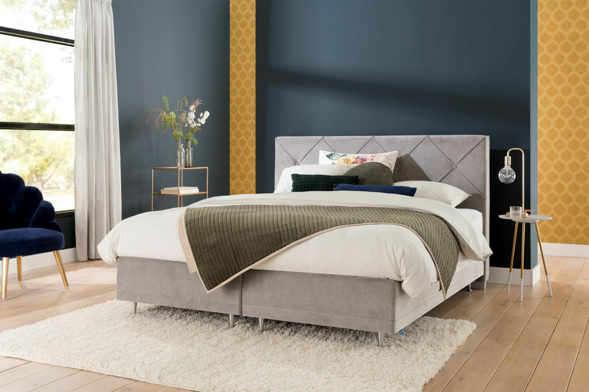 De Pullman Chicago Goldline Boxspring heeft een sterke en klassieke uitstraling. Het hoofdbord is gestoffeerd in een grijze velours stof, waardoor het een betoverende en warme uitstraling krijgt.